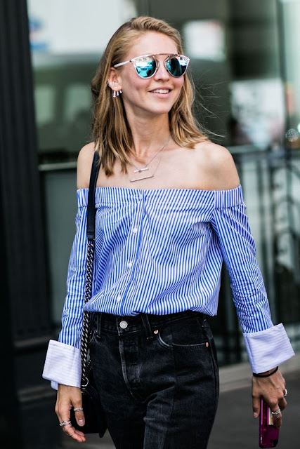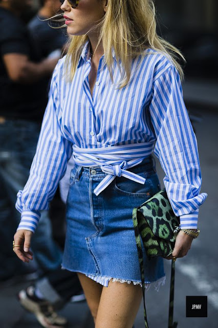Nesta estação, dá-se especial destaque às riscas, especialmente às brancas em fundo azul claro que fazem lembrar o tradicional padrão de algumas camisas masculinas. Mais grossas ou mais estreitinhas, no contexto feminino, estas riscas, podem ser encontradas nas mais variadas peças, podem ser camisas, geralmente destruturadas, tops que remetem para um lado mais girly ou então em camiseiros mais compridos, que podem ser usados como vestidos também! Se se identificam com esta tendência, estas são algumas imagens que vos podem inspirar!