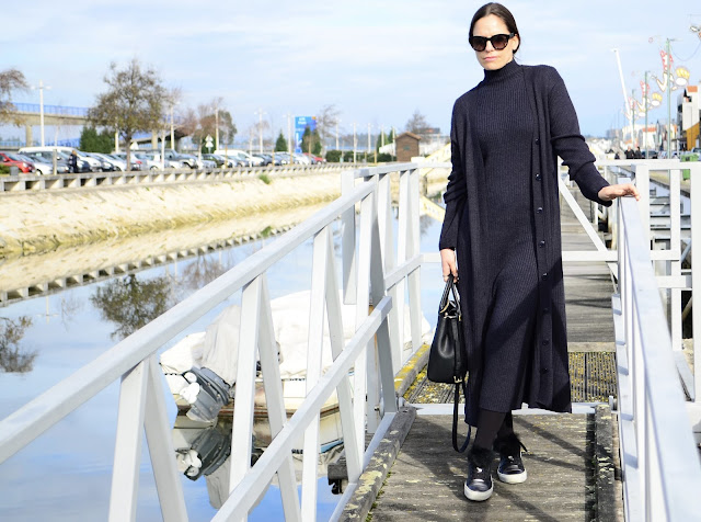 Here are the photos of the look I have chosen and a suggestion how to use a long and fit knitted dress! Combining this kind of dress with a long knitted coat can be a way to preserve the more curvy bodies. In this case I have chosen a pair of sneakers but, you can also use this outfit for work, only changing the shoes.